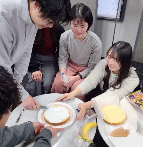12月は、クリスマスケーキ作りのつどいを企画。グループに分かれて、ミニゲームで交流したり、みんなで協力してケーキ作りをする中で、初対面の人同士でもすぐに打ち解け、いろんな話をしながら楽しむことができた。つどいに初めて参加したという未会員たちも「楽しかった!」と大満足。大いに盛り上がった。
