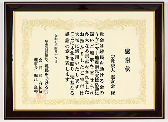 AAR Japan から霊友会に贈られた感謝状