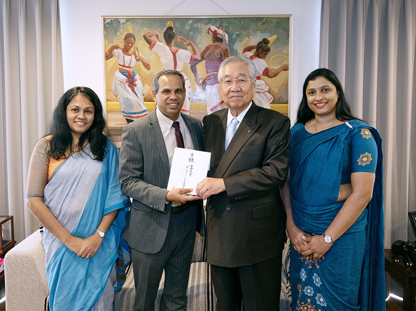 12月22日、末吉会長から駐日スリランカ民主社会主義共和国特命全権大使ピヴィトゥル・ジャナック・クマーラシンハ閣下(中央左)に目録を手渡した